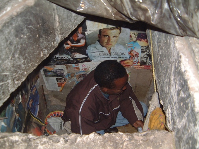 Under midtrabatten i en av hovedgatene, Churchill Road, er det etablert overvannsrør. I tørketiden er dette oppholdsrom for mange gatebarn. Gizachew Ayka tok oss med til en av guttene som hadde sitt tilholdssted her nede. På veggene var det posters av ulike artister. Her så vi også bilder av Elvis og Jesus. Det gjorde sterkt inntrykk.
