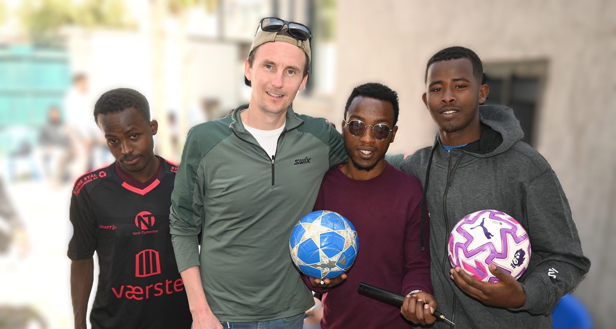 Jostein Bjørnstad bidro med fotballer til guttehjemmet, mens Kai Thorvaldsen hadde en koffert full av fotballdrakter fra Fredrikstad Fotballklubb